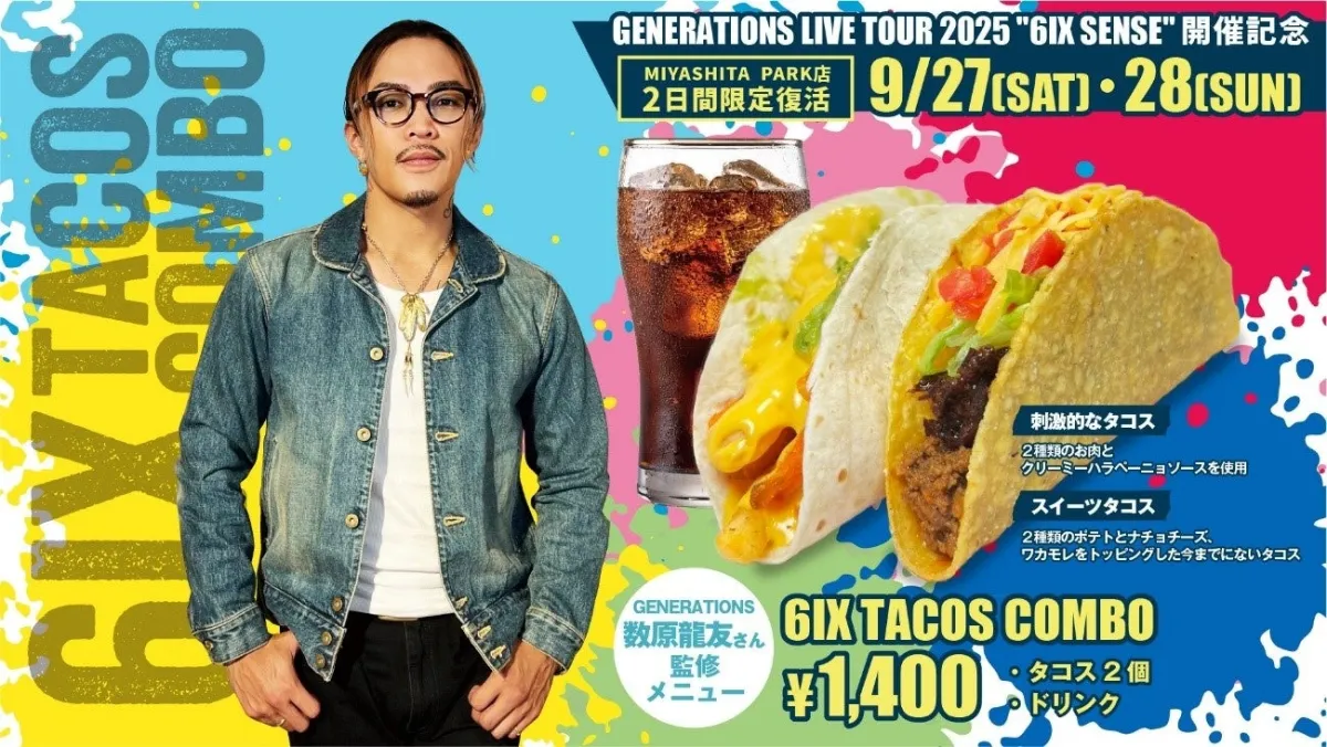 GENERATIONSが待ちに待った2025年のライブツアー「6IX SENSE」のスタートを記念して、国内に数店を展開する人気メキシカンファストフード「Taco Bell」が特別メニューを提供します。その名も「6IX TACOS COMBO」。この魅力的なコラボメニューは、GENERATIONSのボーカル、数原龍友さんとの初のタッグによって実現しました。2025年9月27日(土)から9月28日(日)までの期間限定で、MIYASHITA PARK店にて提供されます。